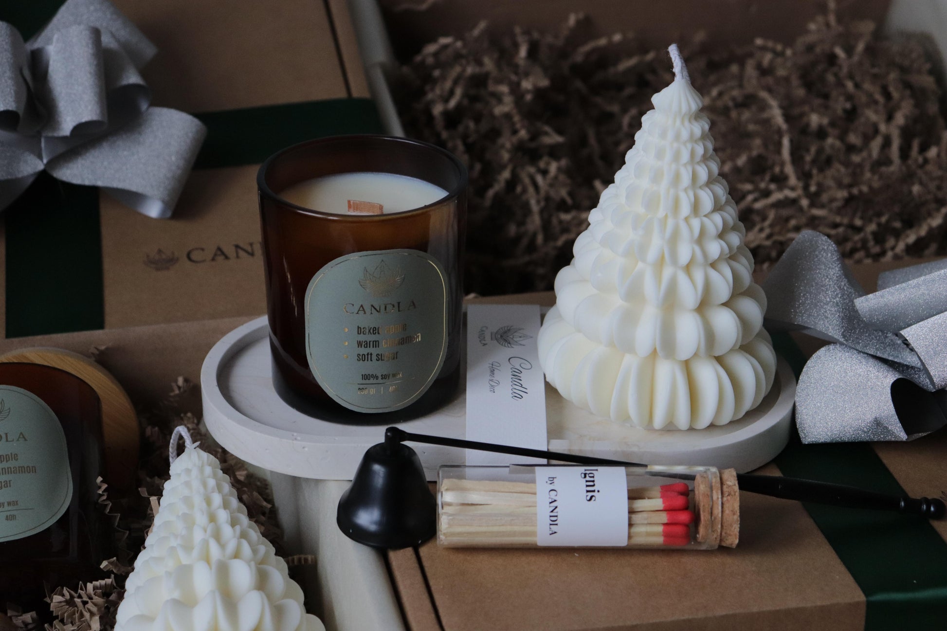 Setul este ambalat în stil CANDLA: cutie kraft rigidă, hârtie fină și panglică premium — pregătit să fie dăruit exact așa cum este.
